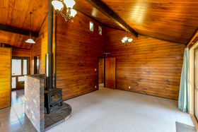 Open plan living flows to decking with north facing conservatory. 2 bathrooms, one being bath and vanity, one being shower and vanity and separate toilet. Spacious kitchen, wood burner, separate laundry and a double garage with a separate hobbies/office room adjacent to the house. Fully fenced flat private section.